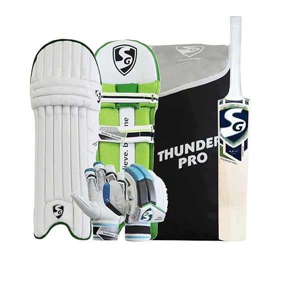 - SG thunder proKashmir Willow cricket kit: The heart of the kit features a premium Kashmir Willow cricket bat, offering a perfect blend of power and precision for powerful strokes and controlled shots.Thunder Pro Bat Comes With Short Handle Size (SH).